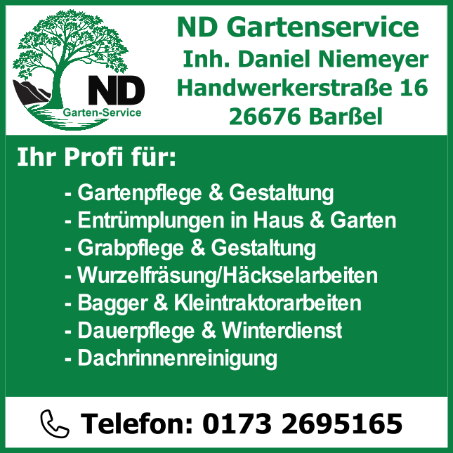 Seit über zehn Jahren verwandelt ND Gartenservice – ehemals Niemeyer Galabau & Mehr – Gärten in gepflegte, lebenswerte Oasen. Unter der Leitung von Daniel Niemeyer arbeitet ein erfahrenes Team, darunter Experten wie Hinrich Haskamp und Heiko Schulte, für Privatkunden, Gewerbekunden, Immobilienverwaltungen und große Einzelhändler. Qualität, Gründlichkeit und ein hoher Anspruch an Verlässlichkeit stehen dabei immer im Mittelpunkt.