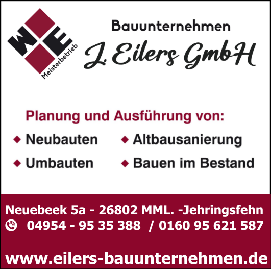 Die J. Eilers GmbH aus Moormerland steht für zuverlässige Planung und professionelle Ausführung von Bauprojekten jeder Größenordnung. Ob Neubau, Umbau, Altbausanierung oder Bauen im Bestand – das Unternehmen vereint handwerkliche Präzision mit technischer Expertise. Unter der Leitung von erfahrenen Maurer- und Stahlbetonmeistern setzt die J. Eilers GmbH auf Qualität, Termintreue und individuelle Lösungen für jeden Kunden.